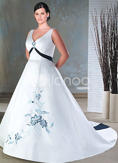 White Sleeveless V Neck Embroidery Plus Size Sash Wedding Dress.